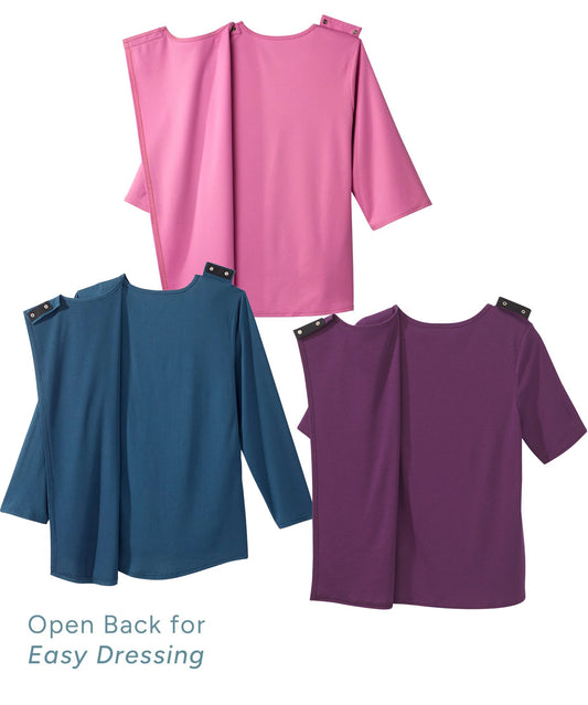 Our open-back tee shirt and collections are crafted for ease of dressing and undressing. These open-back adaptive clothing options are ideal for individuals with limited mobility, making dressing less of a challenge and more of a seamless experience. The open-backed tops feature easy closures like snaps and buttons, eliminating the struggle associated with traditional clothing. We also carry bras for older women with front closures to make getting dresses a breeze.