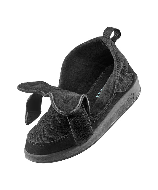 Adaptive slippers are designed to make dressing easier and safer for people with limited mobility, swelling, or sensitive feet. They typically feature extra-wide openings, adjustable Easy Touch (hook-and-loop) closures, non-slip soles, and soft, seam-conscious interiors to reduce pressure points. Many styles also accommodate light bandaging or orthotics for a more customized fit.